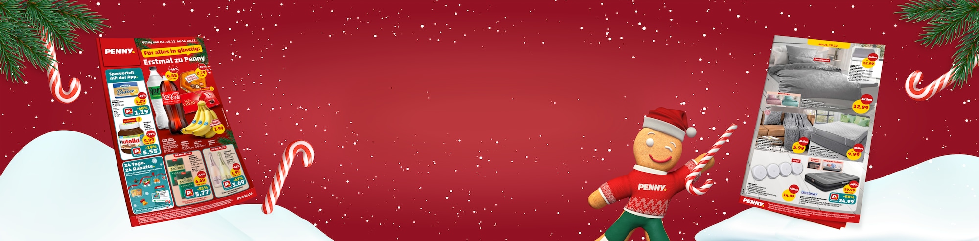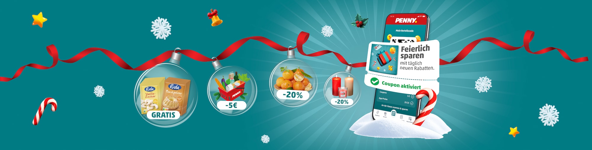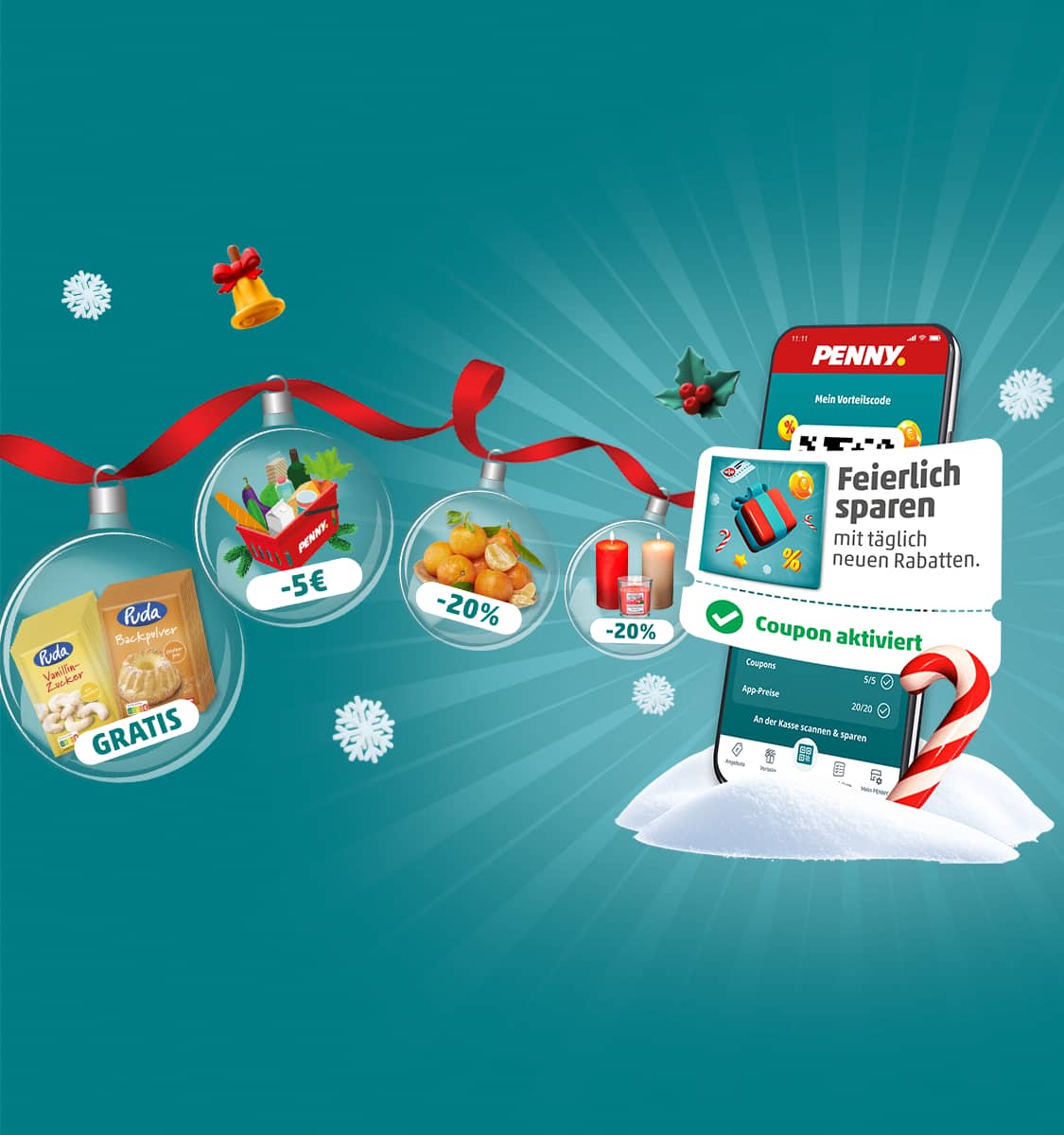 1Aktionszeitraum: 1.12.25 – 24.12.25. Jeder Coupon ist nach Erhalt drei Tage gültig und nach Aktivierung einmalig einlösbar. Beispielhafte Coupons. Diese Coupons unterliegen jeweils gesonderten Einlösebedingungen (wie zum Beispiel einem Mindesteinkaufswert). Für jeweilige Details sowie vollständige Teilnahme- und Nutzungsbedingungen siehe Coupon-Details in der PENNY App oder hier. Voraussetzung ist die Registrierung eines Kundenkontos.