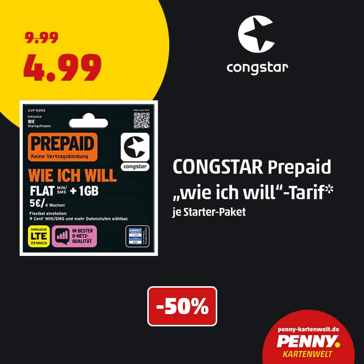 4Aktion gültig im Zeitraum 15.12. bis 21.12.2025 in teilnehmenden Penny Märkten und hier, nur solange der Vorrat reicht, Abgabe in handelsüblichen Mengen. Stand Dezember 2025. Alle Preise verstehen sich inkl. Der gesetzlich gültigen Ust. Änderungen und Irrtümer vorbehalten. Congstar – eine Marke der Telekom Deutschland GmbH, Bayenwerft 12-14, 50678 Köln.