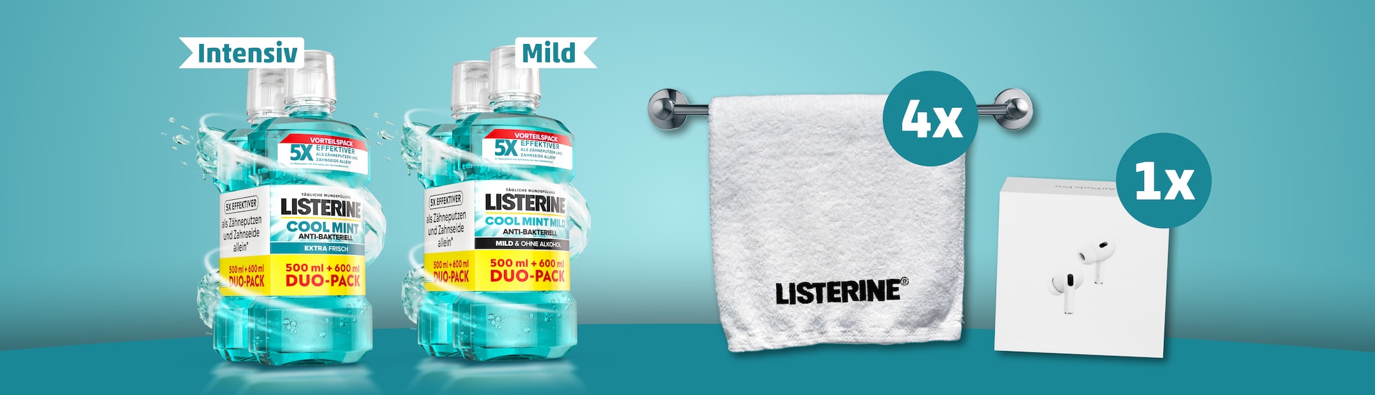 3LISTERINE® unterstützt dich bei deiner täglichen Mundpflege und belohnt dich jetzt doppelt: Gewinne mit etwas Glück 1x AirPods Pro 2 inkl. Produktpaket oder 4x1 exklusives LISTERINE® Handtuch inkl. Produktpaket.