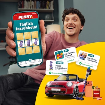 4Aktionszeitraum: 9.3.26 – 5.4.26. Teilnahme ab 18 Jahren pro Person einmal täglich möglich. Voraussetzung ist die Registrierung eines Kundenkontos. Im Fall eines Sofortgewinns erhalten die Gewinner einen Coupon. Couponbedingungen und Einlösehinweise siehe Coupon-Details in der PENNY App. Verlosung der Sachpreise per Zufallsprinzip nach Aktionsende. Abbildungen ähnlich. Vollständige Teilnahme- und Nutzungsbedingungen unter penny.de/app.