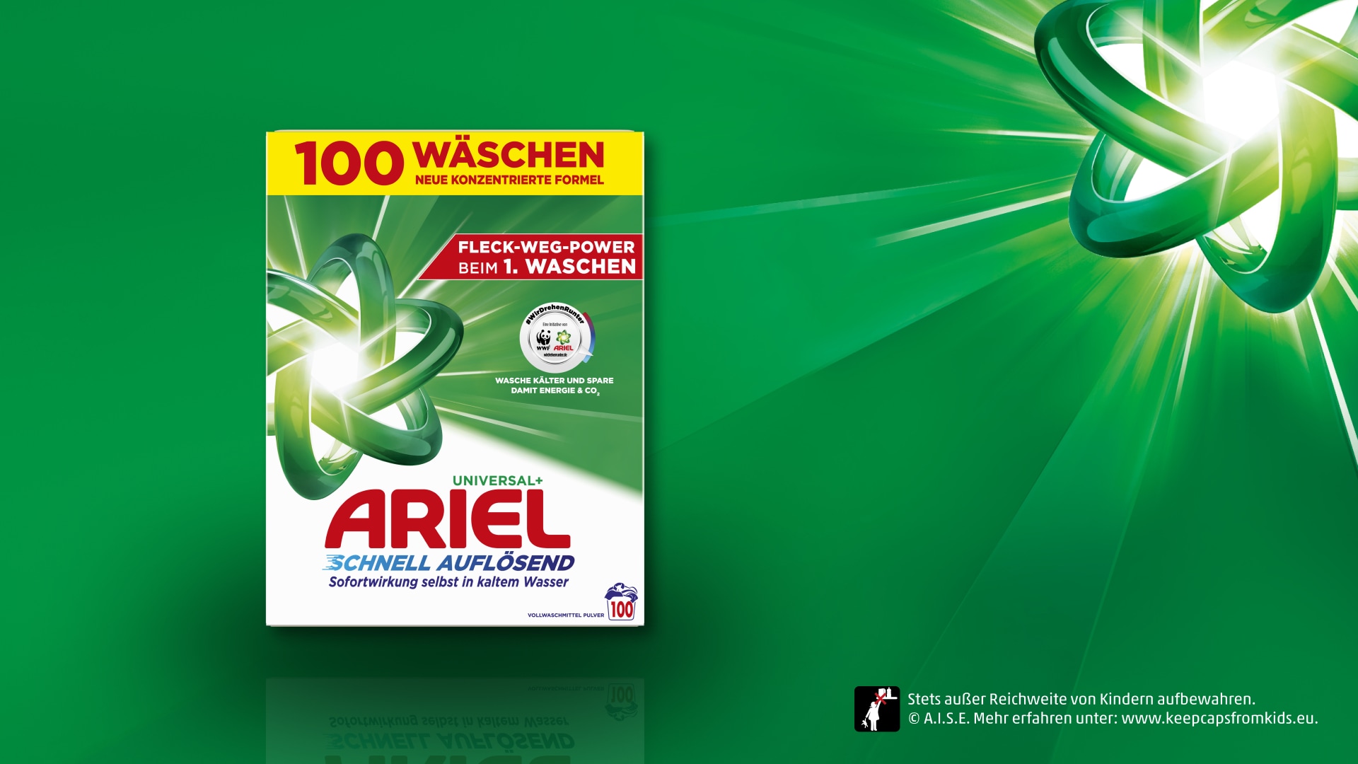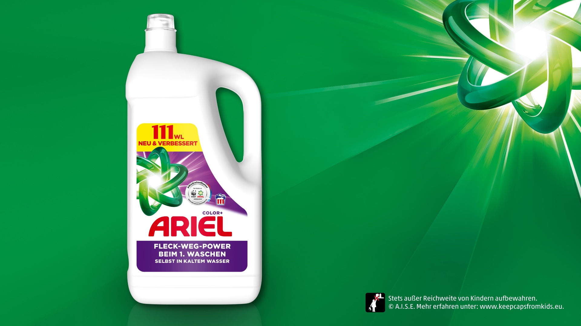 Kaltes Waschen, starke Wirkung: Ariel entfernt 7 Tage alte Flecken selbst in kaltem Wasser.