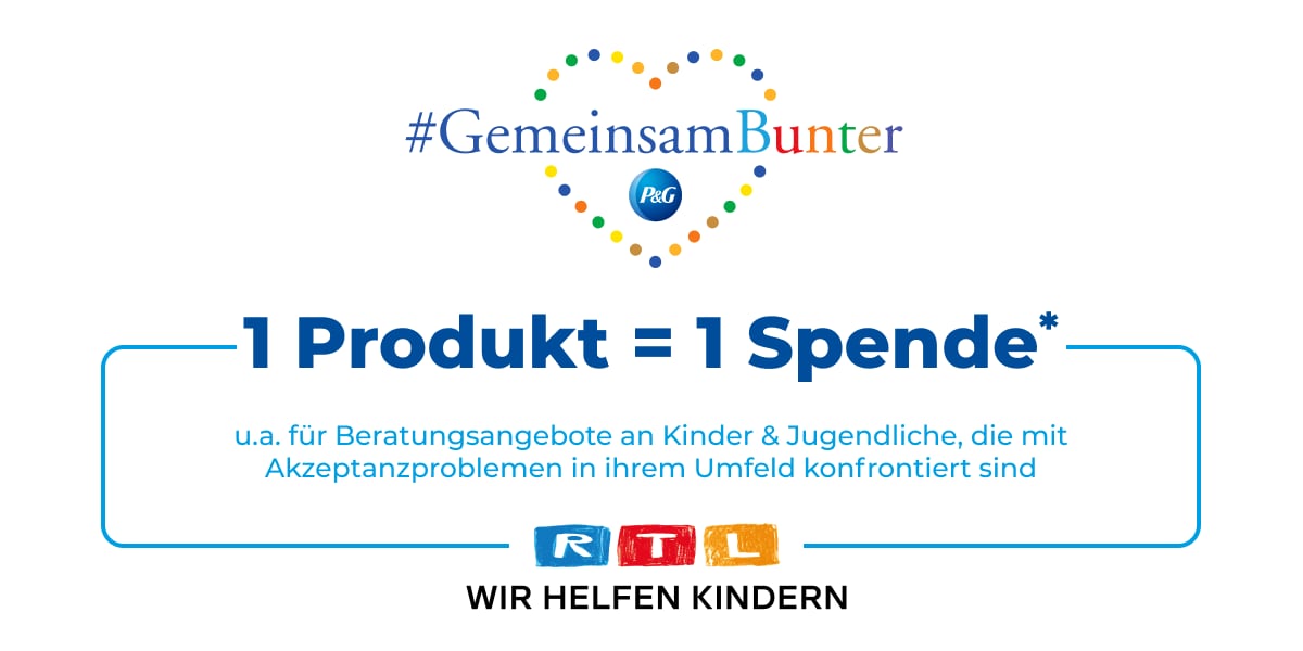 Mit der Initiative „Gemeinsam für eine bunte Gesellschaft“ setzen sich Procter & Gamble und Penny für eine Gesellschaft ein, die Vielfalt feiert und in der alle Menschen einander mit Toleranz, Akzeptanz und Respekt begegnen. Eine Gesellschaft, in der sich besonders Kinder und Jugendliche sicher fühlen und frei entfalten können – unabhängig von Geschlecht, Alter, Herkunft oder persönlicher Überzeugung. Für jedes bei Penny gekaufte P&G Produkt spendet P&G in den jeweiligen Aktionszeiträumen 1 Cent an die "Stiftung RTL - Wir helfen Kindern e.V."* Mehr Informationen findest Du hier.