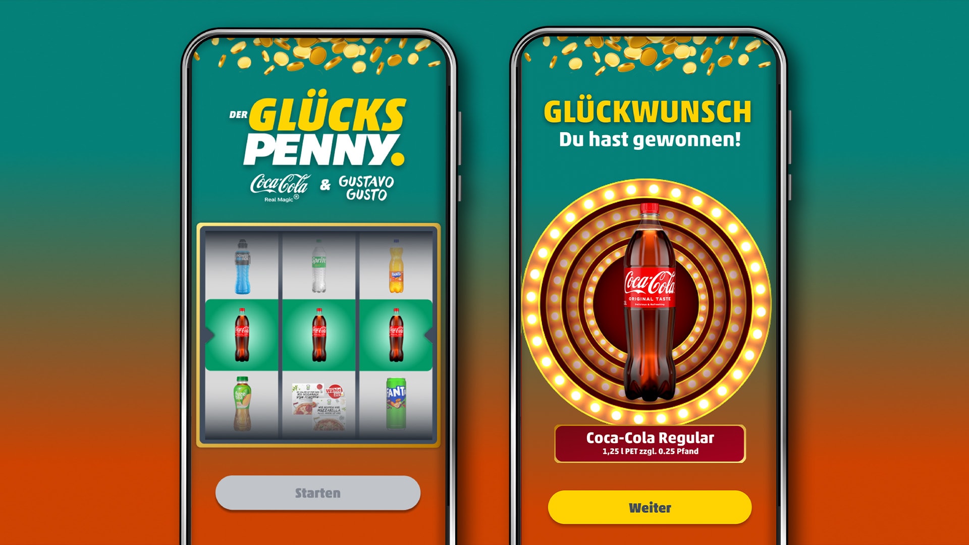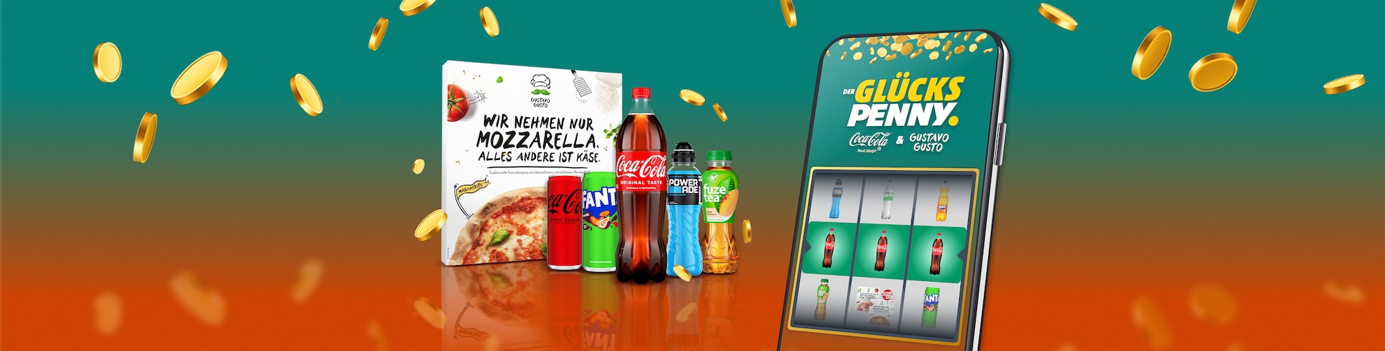 Schnapp dir mit dem GLÜCKSPENNY täglich die Chance auf 1 von 510.000 Drinks von Coca-Cola oder Pizzen von Gustavo Gusto. Einfach in der PENNY App registrieren, mitspielen und deinen perfekten Sommer genießen.*