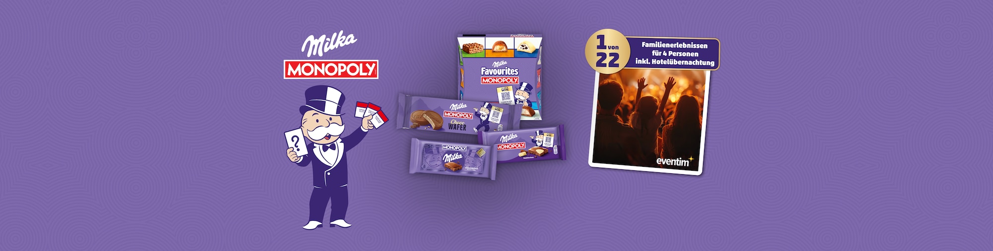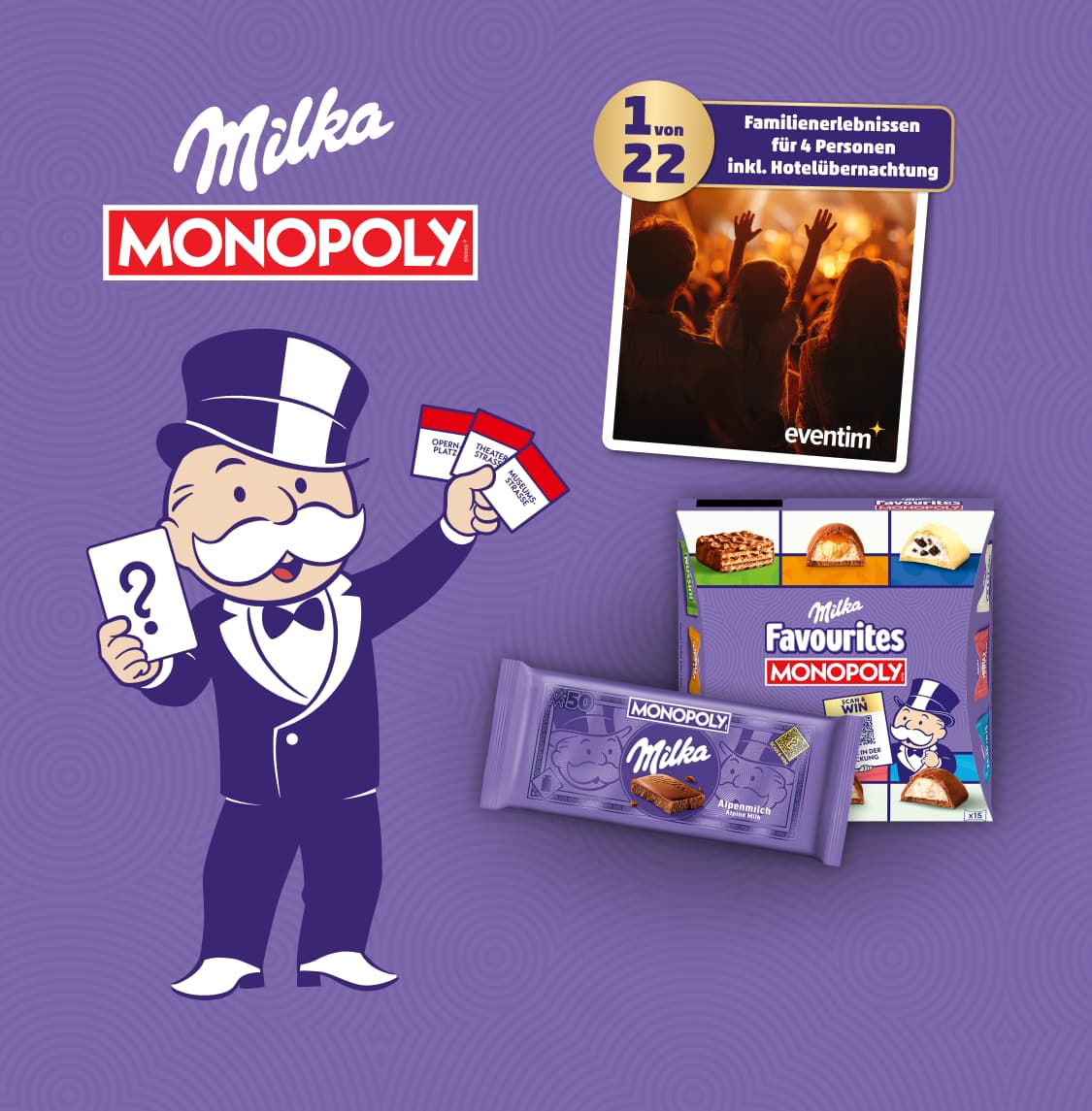 Einfach ein Milka Aktionsprodukt kaufen, den Gewinncode online prüfen und mit etwas Glück 1 von 22 Familienerlebnissen für 4 Personen von EVENTIM, inkl. Hotelübernachtung gewinnen.*