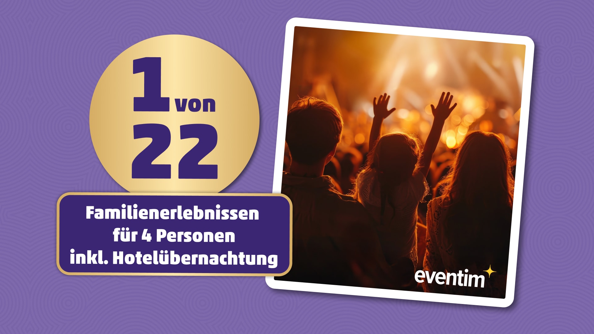 Beim Milka Gewinnspiel hast du die Chance auf 1 von 22 unvergesslichen Familienerlebnissen für 4 Personen mit EVENTIM – inkl. Hotelübernachtung.