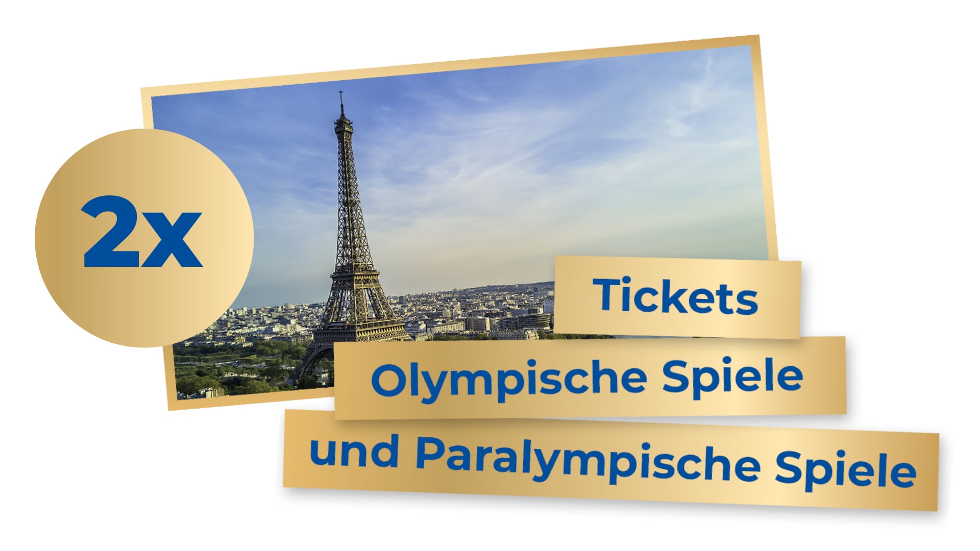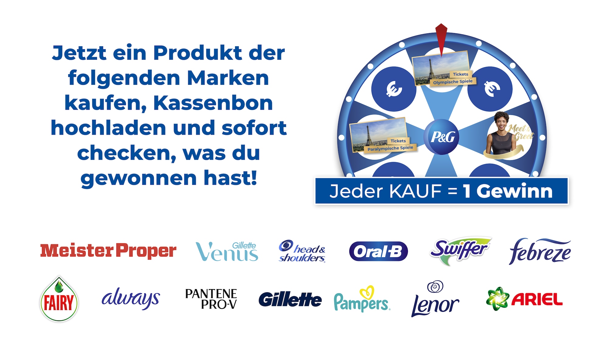 *Gültig beim Kauf von P&G Produkten (ausgenommen sind Arznei- und Nahrungsergänzungsmittel, alle Produkte der Marken Blend-a-dent und Kukident, alle Produkte der Marke Always Discreet sowie die Produkte Always Daily Expert Extra Protect Long und Normal) in der Bundesrepublik Deutschland und anschließendem Hochladen des Kaufbelegs auf www.pg-gewinnspiel.de. Aktionszeitraum: 22.04.2024 – 02.06.2024. Teilnahme ab 18, ausschließlich online möglich. Online Registrierung notwendig. Eine Teilnahme je Kaufbeleg möglich. Ein Gewinn je vollständiger Teilnahme. Originalkaufbeleg aufbewahren. Hochladen des Kaufbelegs muss spätestens bis zum 09.06.2024 erfolgen. Zu den zu verlosenden Gewinnen gehören Geldbeträge in Höhe von 0,50 €, 1 €, 2 €, 5 € und 10 €; Tickets für die Olympischen und Paralympischen Spiele Paris 2024; sowie Tickets für ein Meet & Greet mit Malaika Mihambo. Ausführliche Teilnahmebedingungen auf www.pg-gewinnspiel.de.