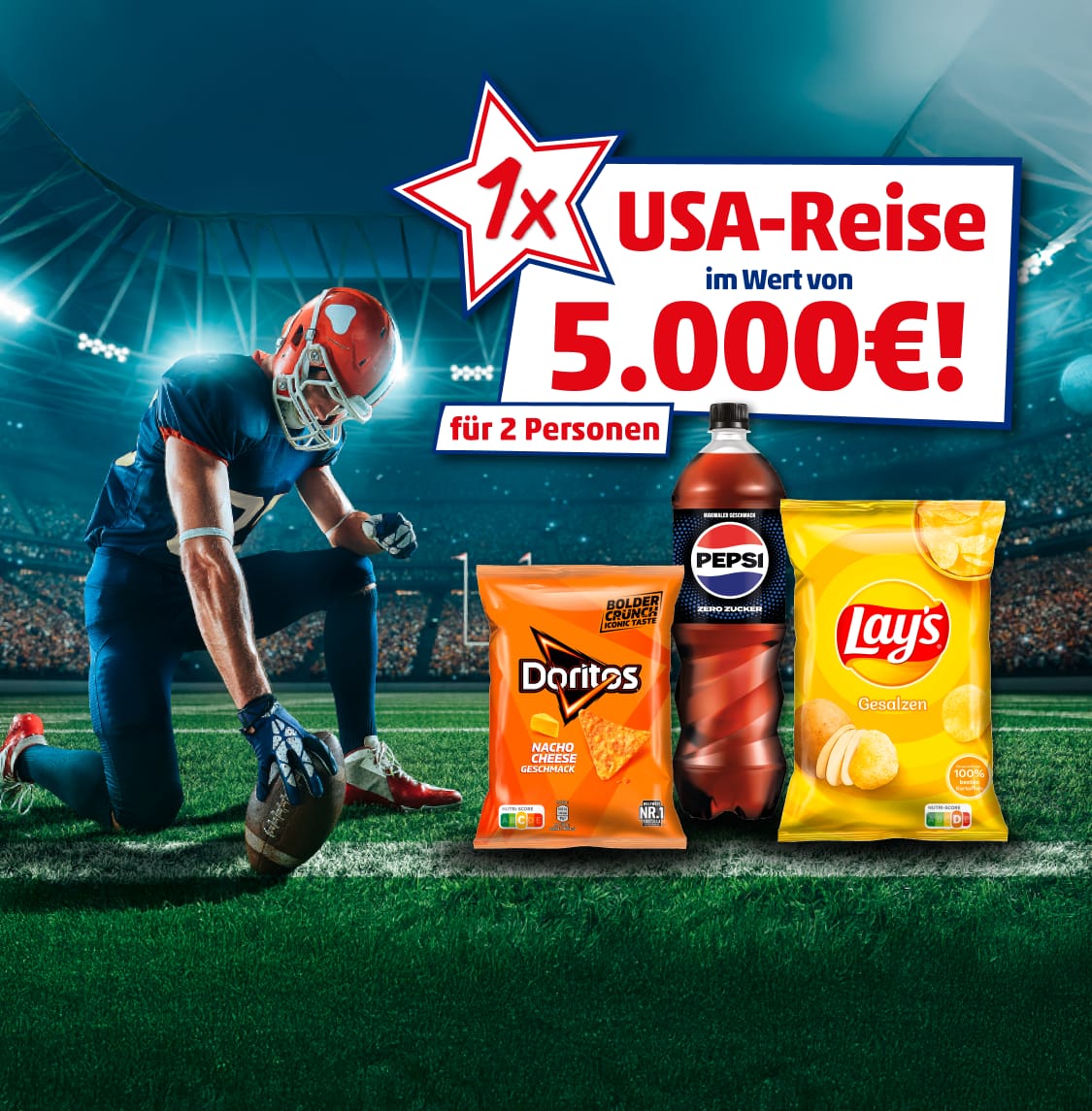 PepsiCo schickt dich ins Land des Footballs! Mach jetzt beim Gewinnspiel mit und sichere dir die Chance auf eine unvergessliche USA-Reise für 2 Personen im Wert von insgesamt 5.000 €.*