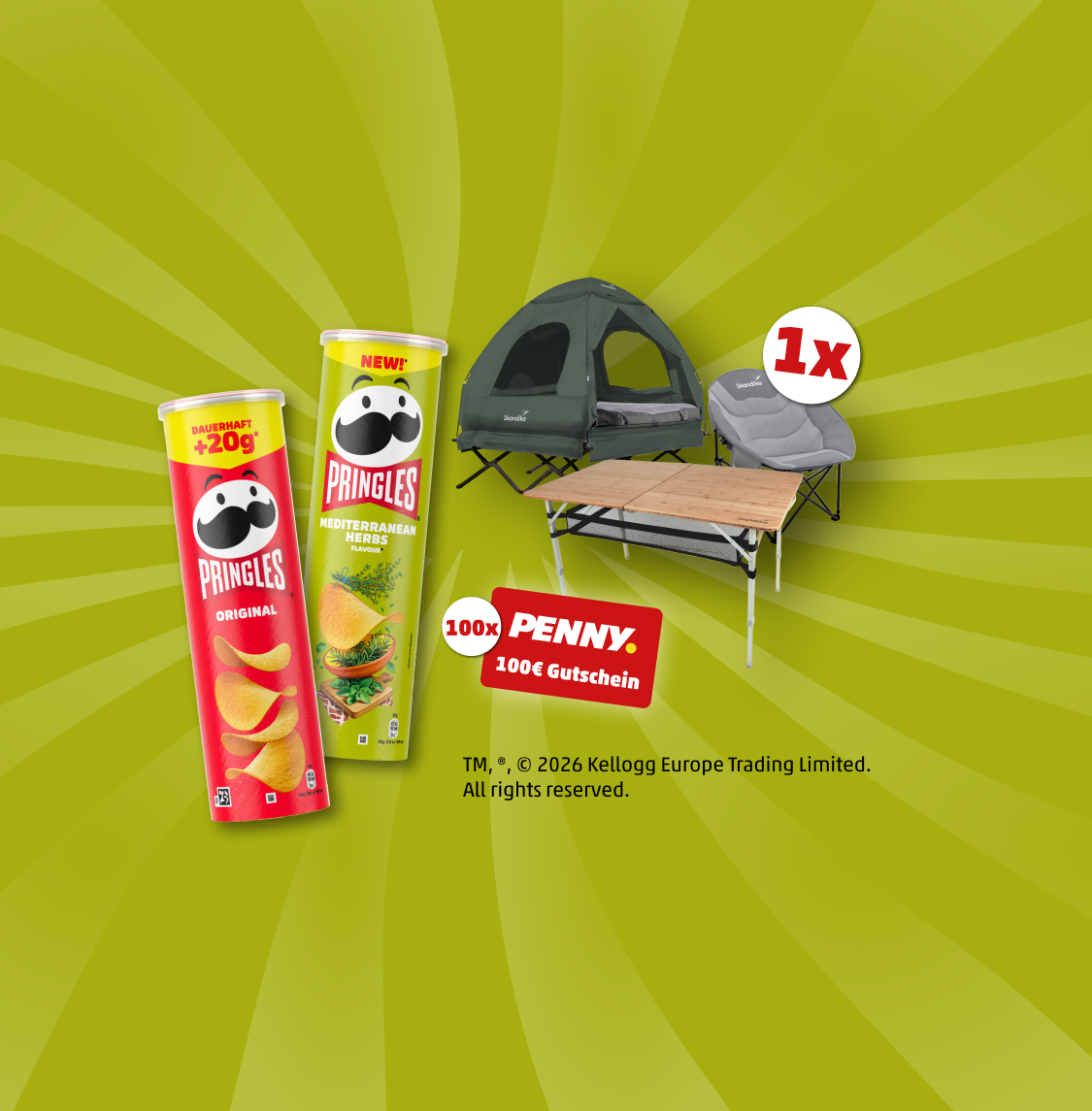 Mach mit bei unserem Gewinnspiel, knack die Pringles® Quizfrage und sichere dir mit etwas Glück den Hauptgewinn eines Skandika Campingsets oder einen von 100 Penny-Gutscheinen im Wert von 100€.