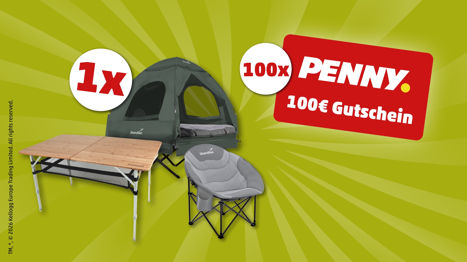 Sichere dir jetzt die Chance auf den Hauptgewinn eines Skandika Campingsets oder einen von 100 Penny-Gutscheinen im Wert von 100€.