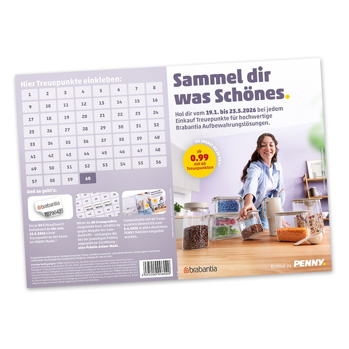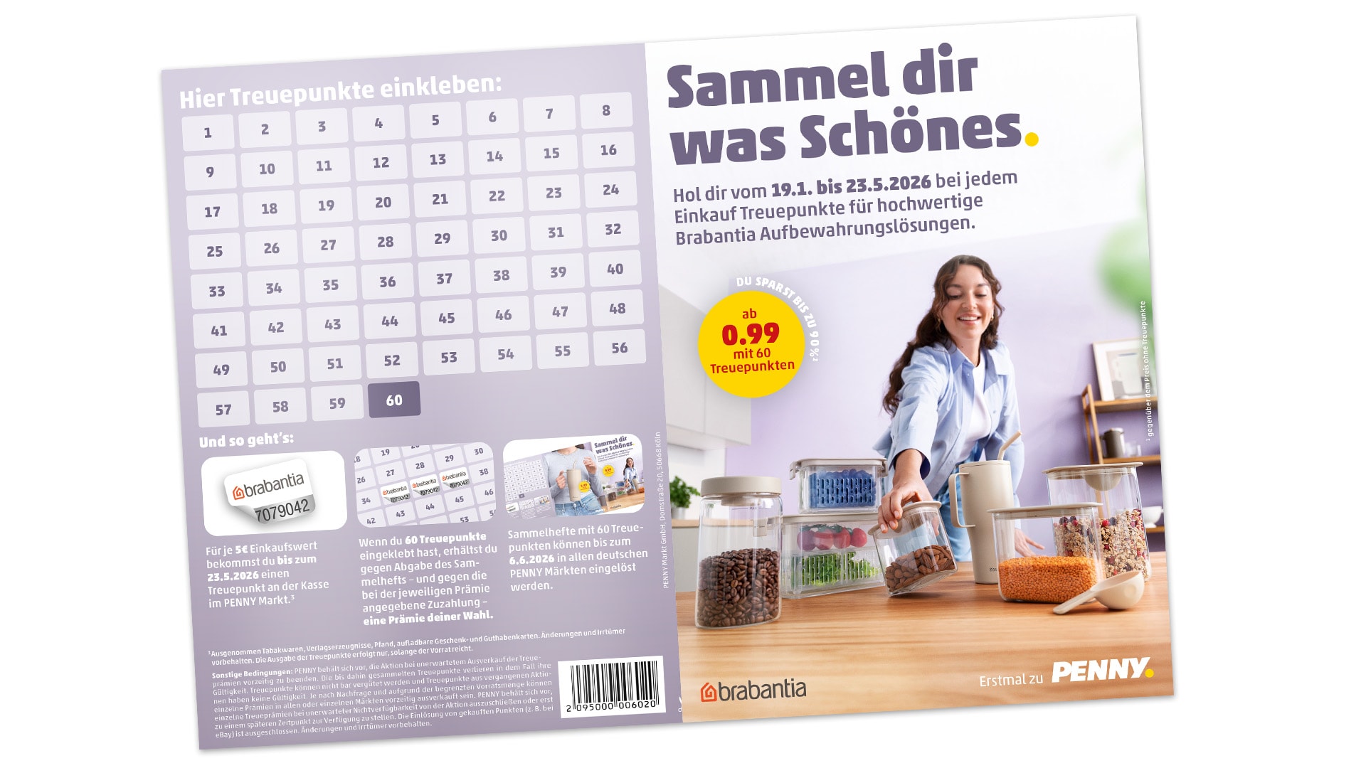 Du erhältst das Sammelheft zur Treueaktion entweder an der Kasse in deinem PENNY Markt oder kannst es dir hier ganz einfach downloaden. Dann kannst du bei deinem Einkauf fleißig Treuepunkte sammeln und einkleben, um eine Prämie deiner Wahl zu erhalten. Auf geht's!