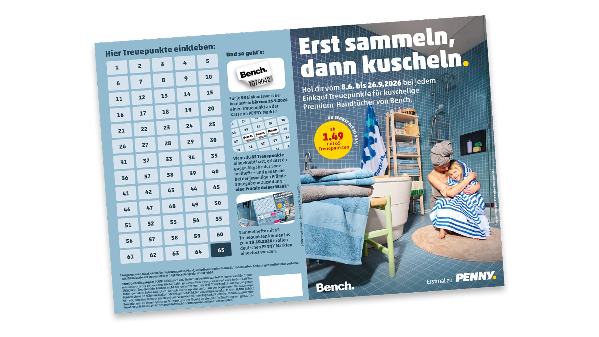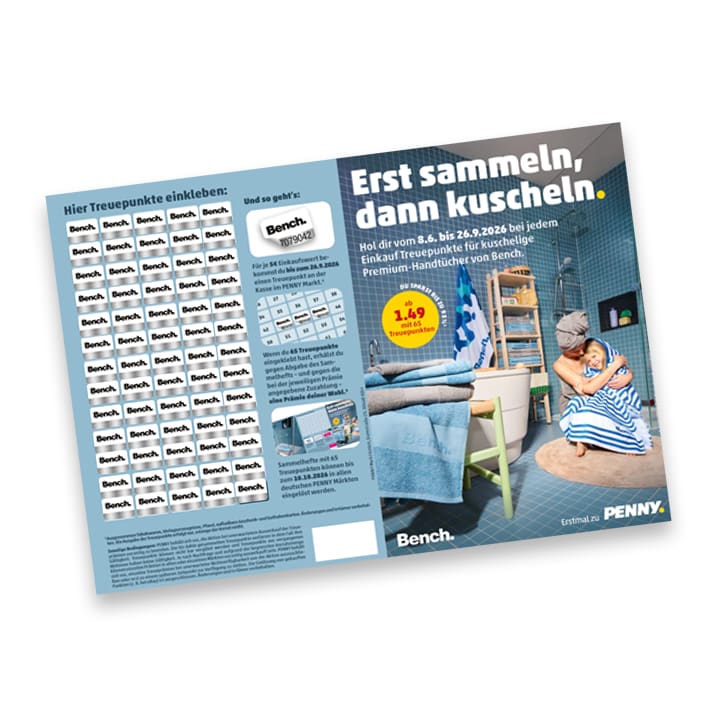 Du erhältst das Sammelheft zur Treueaktion entweder an der Kasse in deinem PENNY Markt oder kannst es dir hier ganz einfach downloaden. Dann kannst du bei deinem Einkauf fleißig Treuepunkte sammeln und einkleben, um dir dein kuscheliges Premium-Handtuch ins Bad zu holen. Auf geht's!