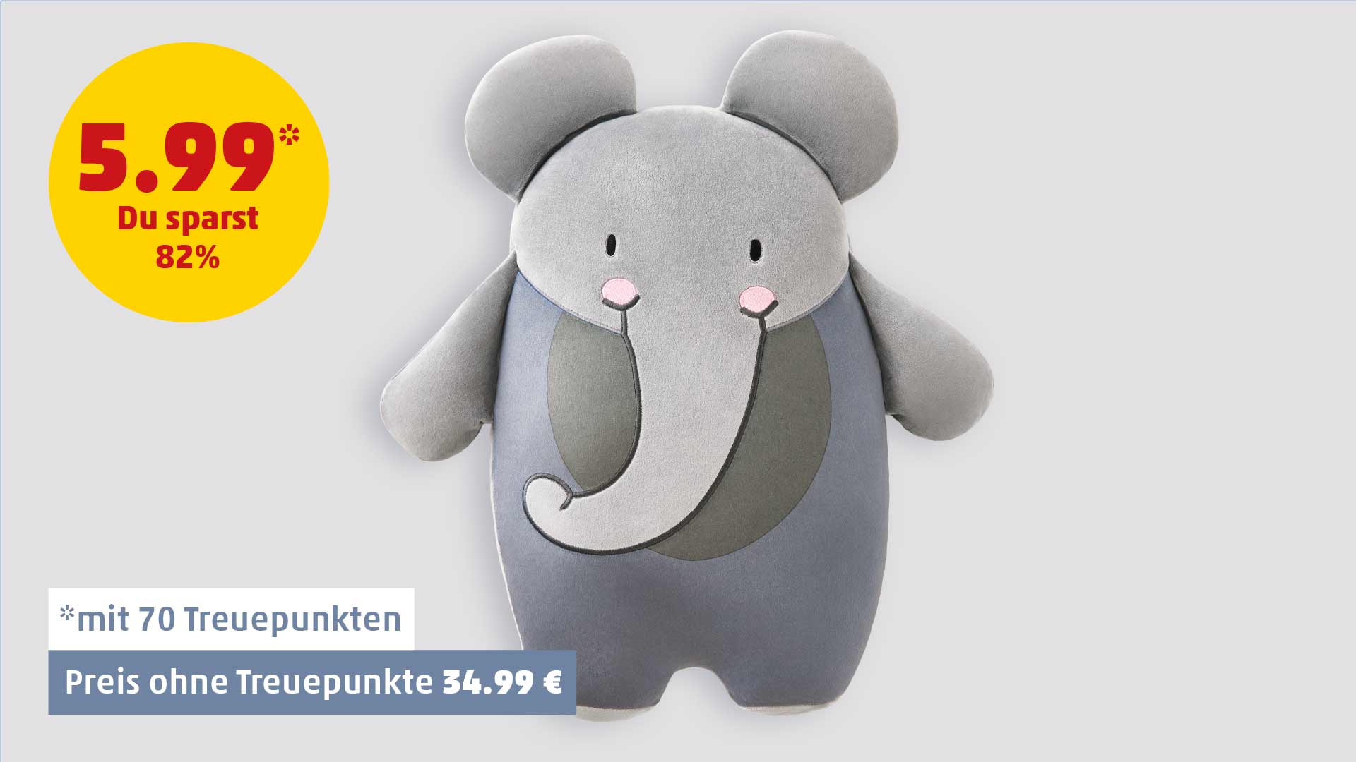 Tööööröööö, jetzt heißt es schnell sein. Denn unsere beliebten Elefantenkissen (100% Polyester) haben bald alle schon ein neues Zuhause. Sammle jetzt noch Treuepunkte und freue dich darauf, kuschelig einzuschlafen.