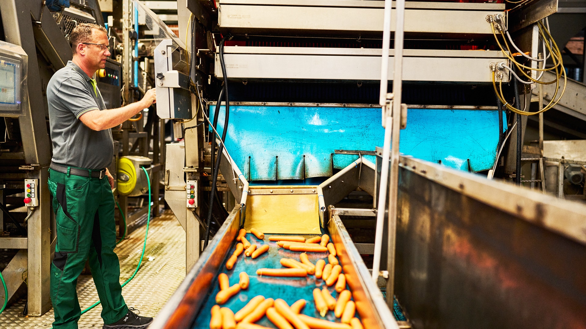 Frisch vom Feld geht’s für die Möhren direkt zum Waschen. Mit mehreren Durchläufen in einer Bürstenmaschine werden sie auf dem Hof von Tobias Brun gründlich gereinigt. Sortiert wird genauso sorgfältig: Das Grobe übernehmen Computer – die finale Einteilung läuft über die erfahrenen Mitarbeitenden. Nach Dicke und Länge verpackt kommen die knackigen Möhren dann direkt in die Auslage in deinem Markt.