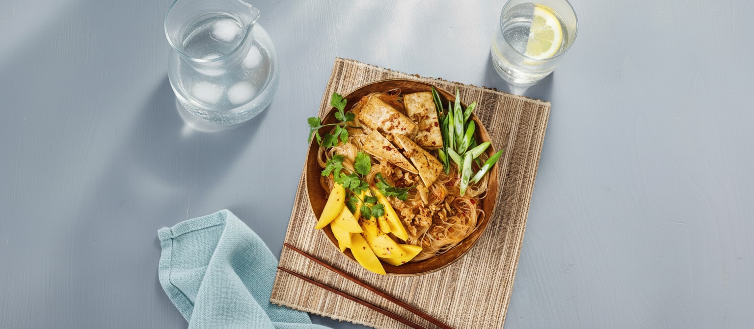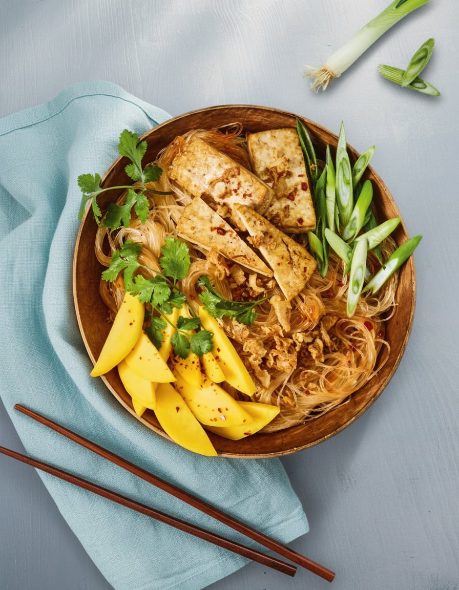 Glasnudeln nach Packungsanweisung zubereiten. Dann mit dem Dressing vermengen. Glasnudeln, Mango, Frühlingszwiebeln und Tofu in einer Schale anrichten. Mit Röstzwiebeln und Chiliflocken bestreuen und nach Belieben mit Koriander garniert servieren.