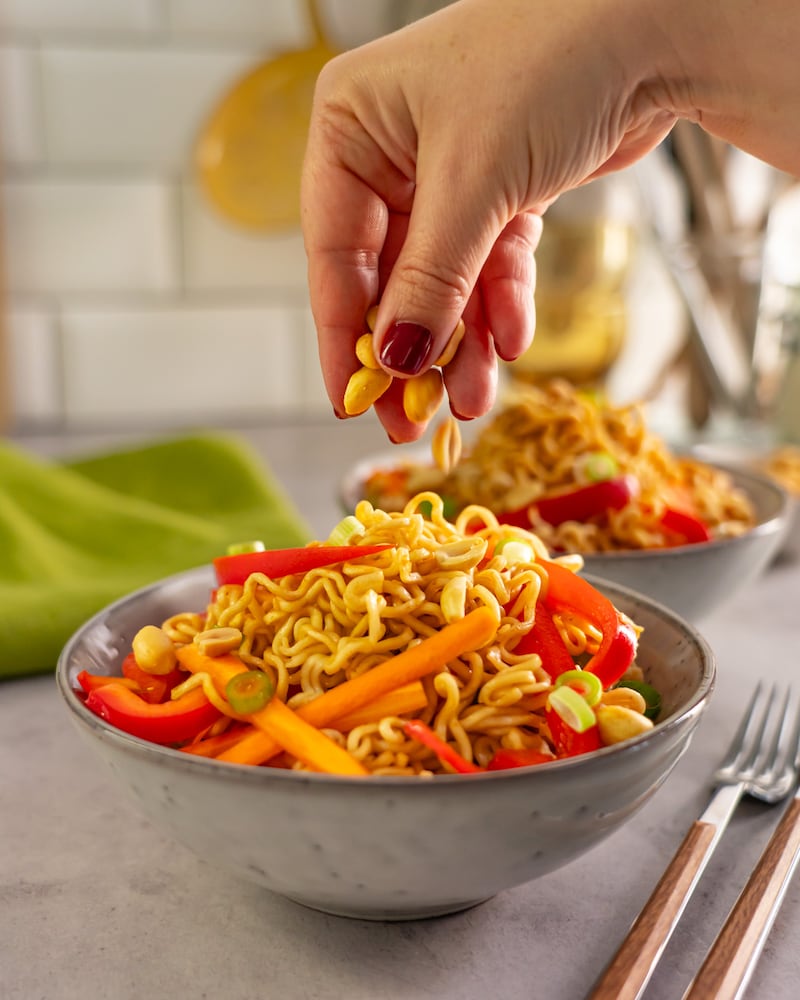 In einer Schüssel Gemüse, Mie-Nudeln und das Dressing vermischen. Salat ca. 10 Min. durchziehen lassen, dann in Schüsseln oder auf Salattellern anrichten und mit den Erdnüssen toppen.