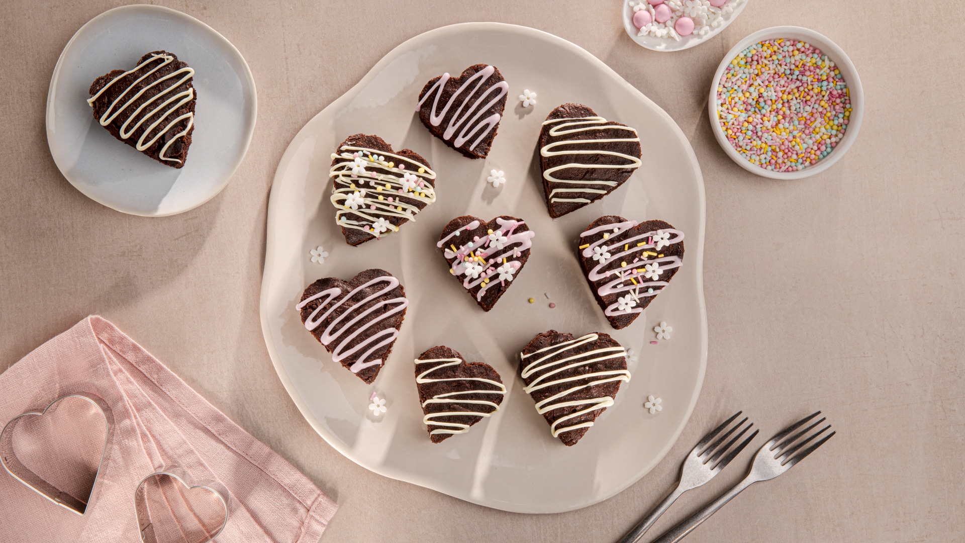 Aus Puderzucker, rosa Farbpaste und 1–2 EL Wasser einen Zuckerguss anrühren. Die Brownie Herzen mit weißer Kuvertüre, rosa Zuckerguss und Streudekor garnieren.