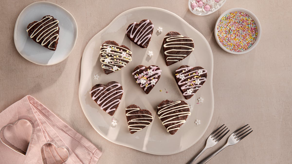 Die Brownies vollständig auskühlen lassen, dann aus der Form nehmen. Nun mit Herzaustechern (ca. 7 cm) Herzen aus dem Teig ausstanzen. Die Browniereste kannst du entweder direkt essen oder aber du zauberst unsere Cakepops aus Kuchenresten daraus.