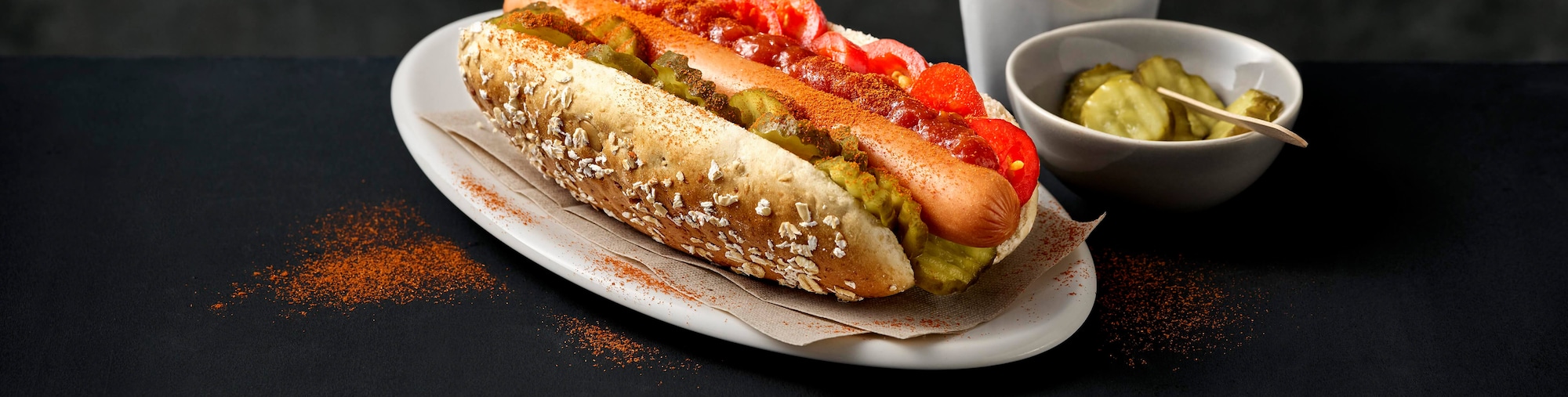 Heiß, heißer, Original Hot Hot Dog! Wenn du es scharf magst, ist dieser Hot Dog deine erste Wahl: Nimm dir ein würziges Fire Dog Würstchen, Red Jalapeno Rings und Tomatensauce, packe alles in eine kernige Haferflocken Roll.