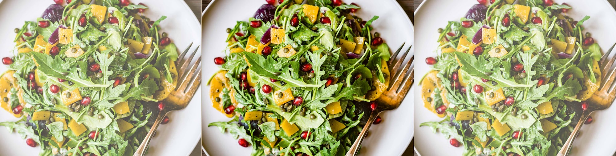 Rucola, Kürbisstücke, Zwiebeln, Essig, Granatapfelkerne und übriges Olivenöl miteinander vermischen. Alles mit Salz und Pfeffer abschmecken. Salat auf Tellern anrichten und servieren.