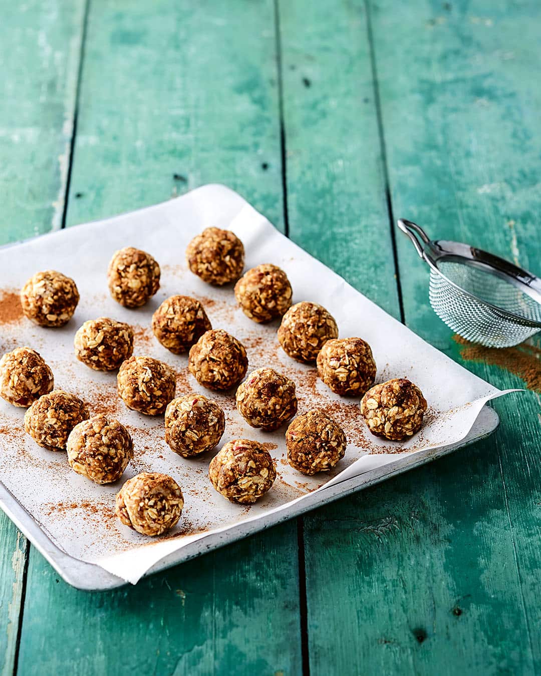Jeweils etwas von der Masse abnehmen und zu 2,5 bis 3 cm großen Kugeln formen. Die Energy Balls für ca. 30 Minuten kühl stellen, damit sie eine gewisse Festigkeit bekommen. Danach könnt ihr die Kügelchen mit Zimt bestäuben und servieren.