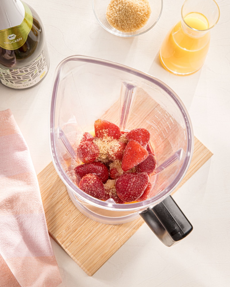 Gefrorene Erdbeeren, Zucker und Orangensaft im Standmixer fein pürieren und in Gläser (mind. 0,3 l) füllen.