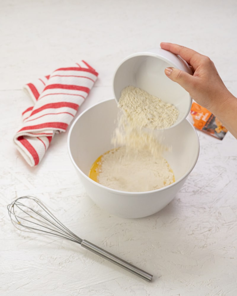 Mehl und Backpulver ordentlich vermischen, bevor sie nach und nach mit der Zucker-Ei-Masse weiterverarbeitet werden. So lange rühren, bis der Teig schön cremig ist.
