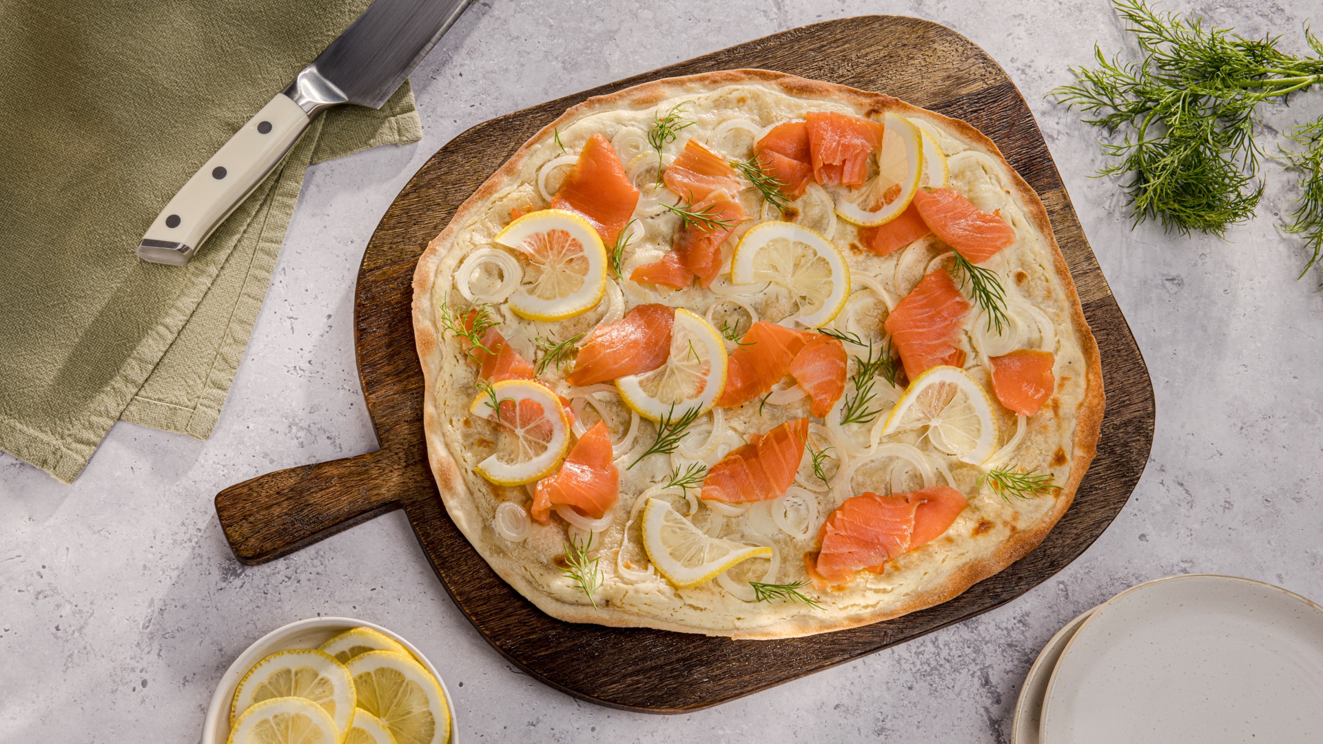 Lachsstreifen, Zitrone und Dill auf dem heißen Flammkuchen anrichten und sofort servieren.