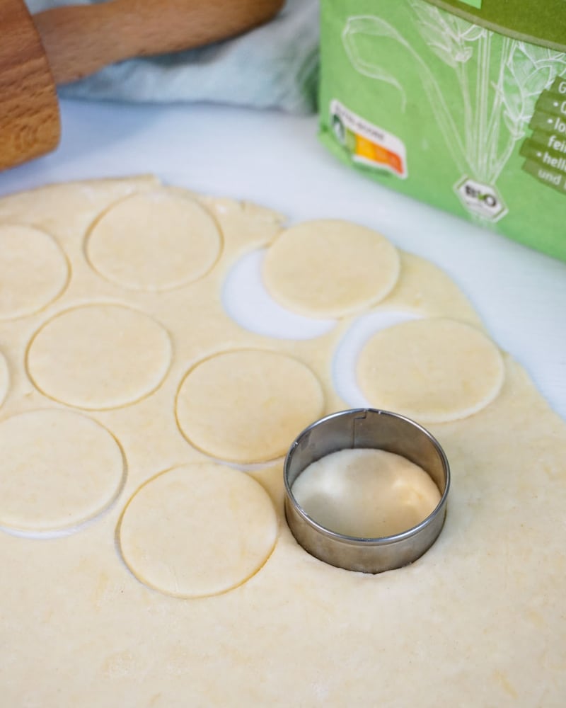 Teig dünn auf einer mit Mehl bestreuten Arbeitsfläche ausrollen. Runde Cracker ausstechen, z.B. mit einem Plätzchenausstecher oder einem Schnapsglas. Teiglinge auf dem Blech verteilen.
