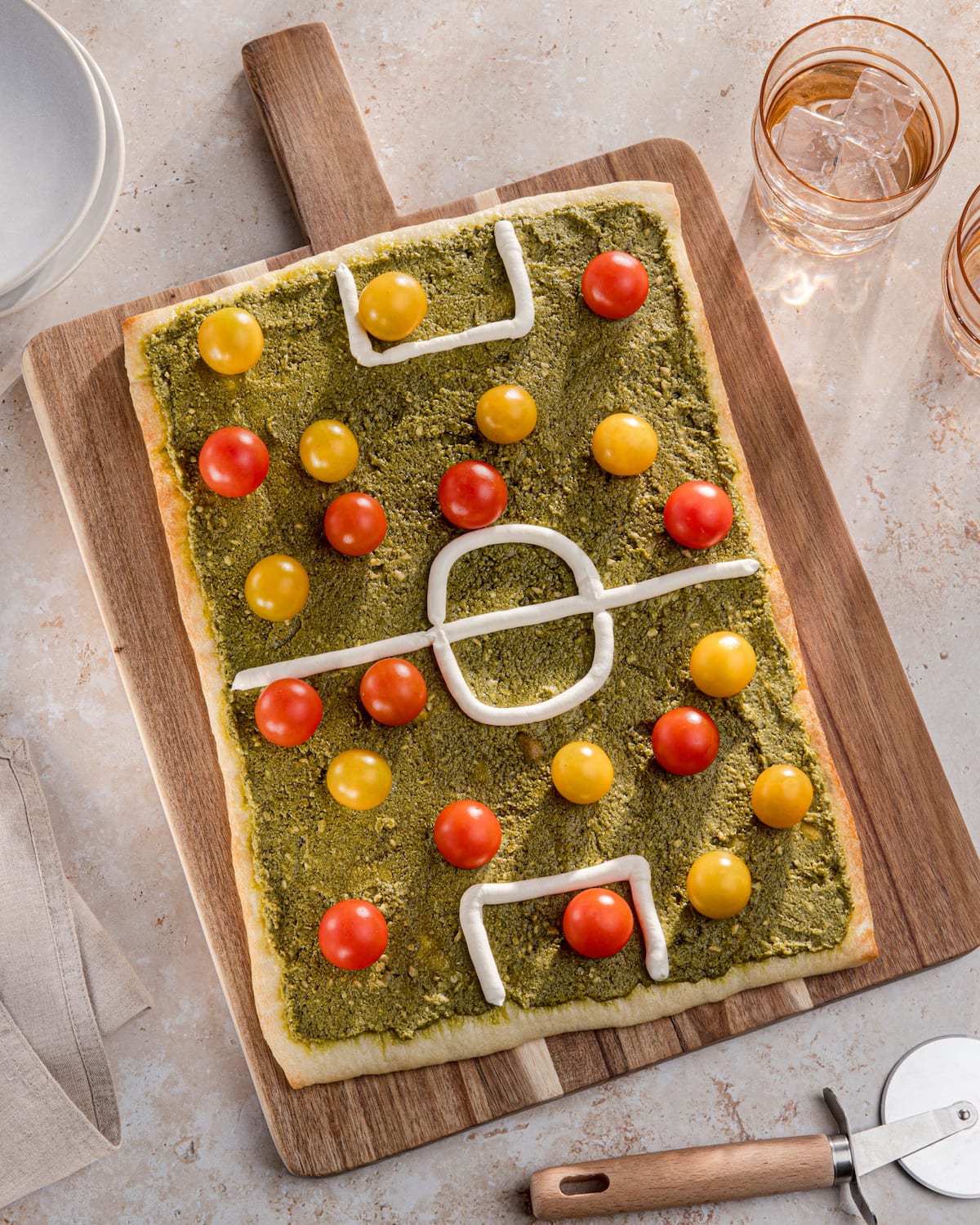 Crème fraîche in einen Spritzbeutel mit schmaler Tülle füllen und auf der Pizza als Fußballfeldmarkierung (u.a. Mittellinie, Anstoßkreis, Straf- und Torraum) verteilen – nach Belieben auch mit Seitenlinien. Alternativ einen kleinen Plastikbeutel verwenden und eine kleine Ecke abschneiden.