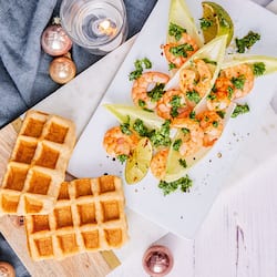 Ein paar Spritzer Zitronensaft über die Garnelen geben und mit Petersilie bestreuen. Dazu passen ein frischer Dip und Baguette.