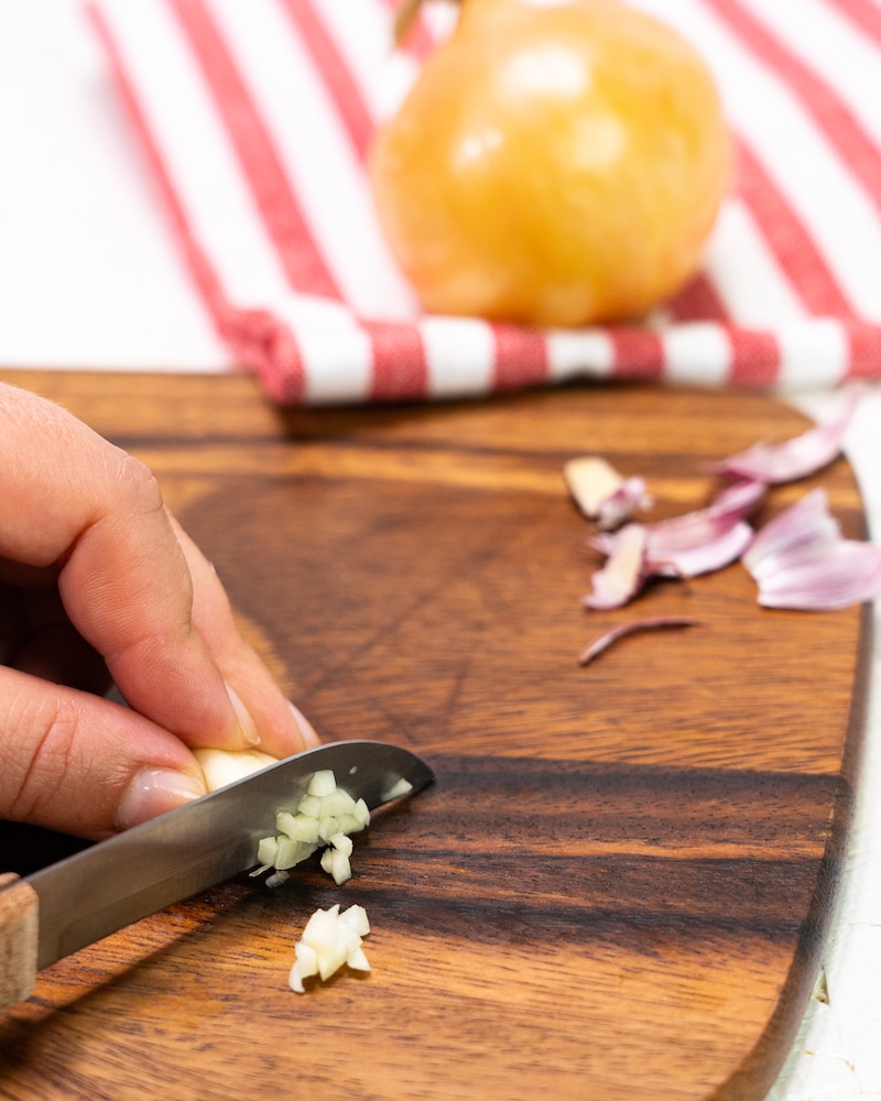 Das Avocadofleisch fein würfeln, direkt mit Zitronensaft beträufeln und in eine Schüssel geben. Die Zwiebeln und Knoblauchzehen schälen und in feine Würfel schneiden. Die Cocktailtomaten waschen, trocken tupfen und halbieren.