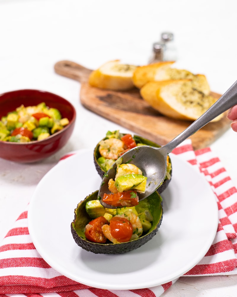 Anrichten: Das noch warme Baguette in Scheiben schneiden. Die Avocado-Garnelen-Füllung in die Avocadoschalen füllen und zusammen mit den Baguettescheiben servieren.