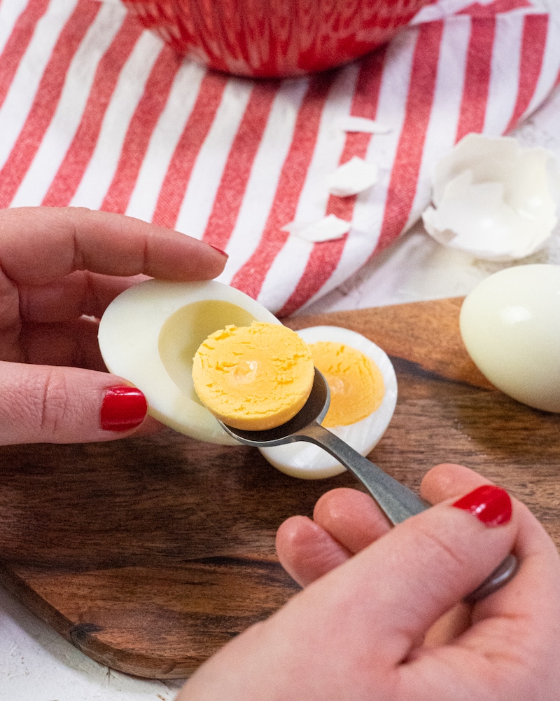 Wenn die Eier soweit sind, nimmst du sie aus dem Topf und schreckst sie mit kaltem Wasser ab. Nun kannst du sie pellen, der Länge nach halbieren und das Eigelb vorsichtig mit einem Teelöffel in einen Mixbecher geben und mit dem Stabmixer pürieren oder einen Standmixer verwenden.