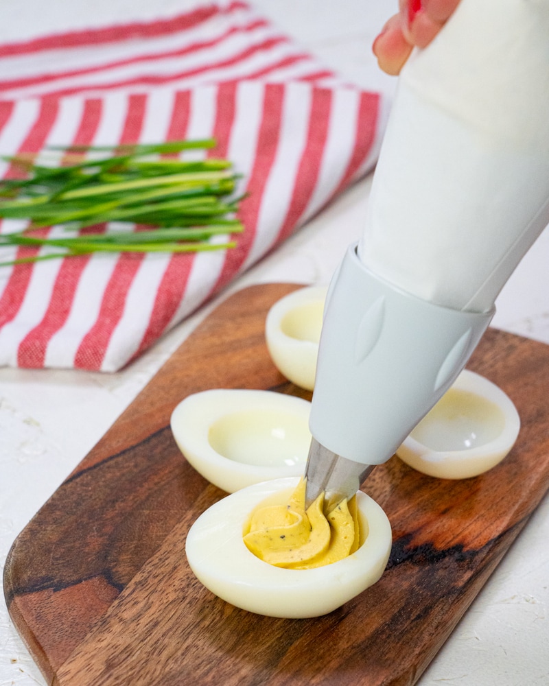 Rühre noch schnell den gehackten Schnittlauch unter die Masse und schmecke mit Salz und Pfeffer ab. Du kannst deine Füllung einfach mit Hilfe von zwei Teelöffeln in die ausgehöhlten Eierhälften geben oder aber du verwendest dafür einen Spritzbeutel mit Tülle. Ganz cool sieht es aus, wenn du Bällchen mit einem Eisportionierer kugelrund formst. Auf jede Eihälfte kannst du zum Schluss einen halben Schnittlauchhalm legen – etwas Deko kann ja nicht schaden.