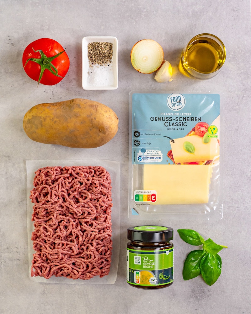 Genuss-Scheiben klein schneiden und mit dem veganen Hack, Zwiebel-, Knoblauch- und Tomatenstückchen, Olivenöl und dem Basilikum in einer Schüssel locker vermischen und mit Salz und Pfeffer würzen.