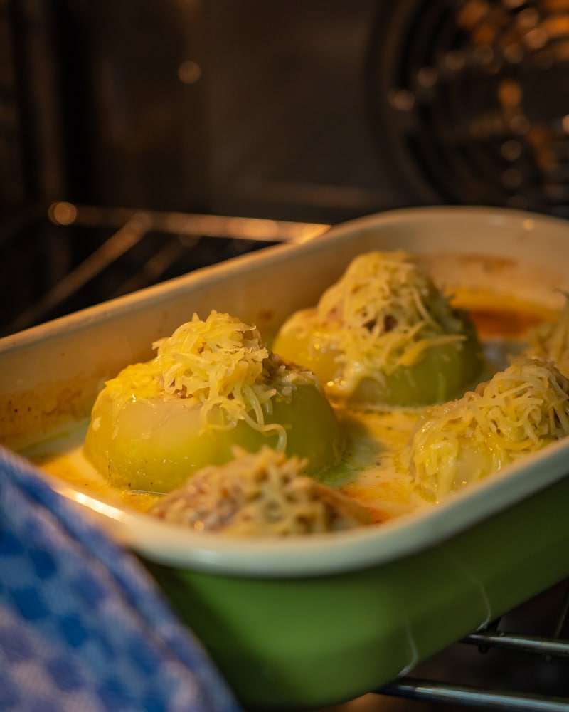 Kohlrabis mit der Masse füllen und in eine ofenfeste Form setzen.