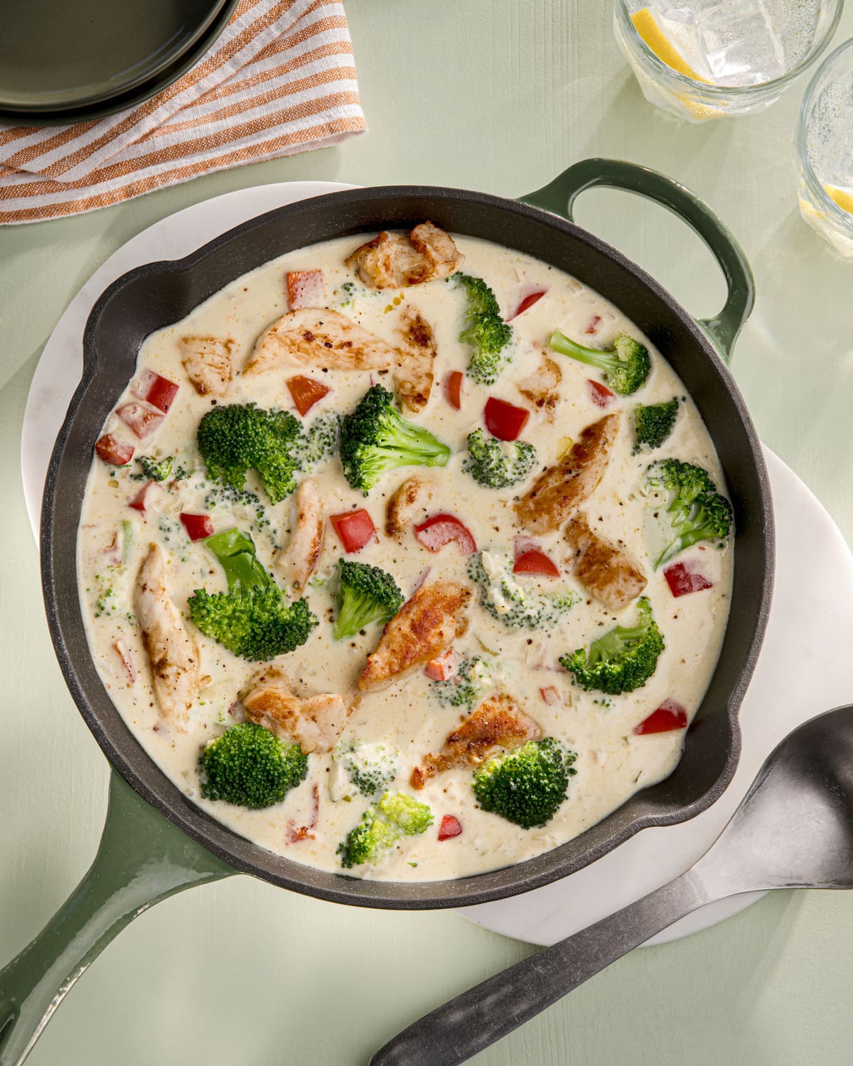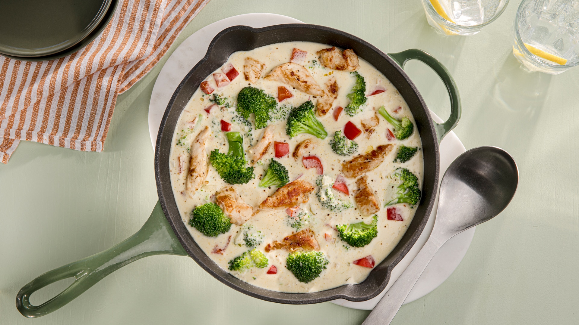 Damit Brokkoli seine Farbe und Biss behält, solltest du frische Röschen nur ganz kurz in kochendem, gesalzenem Wasser blanchieren und dann in Eiswasser abschrecken. In der milden Frischkäsesoße gart er wenige Minuten sanft nach, dann wird er nicht matschig. Auch Paprika und Zwiebeln profitieren von kurzer Garzeit – so bleibt die Pfanne frisch, bunt und aromatisch.