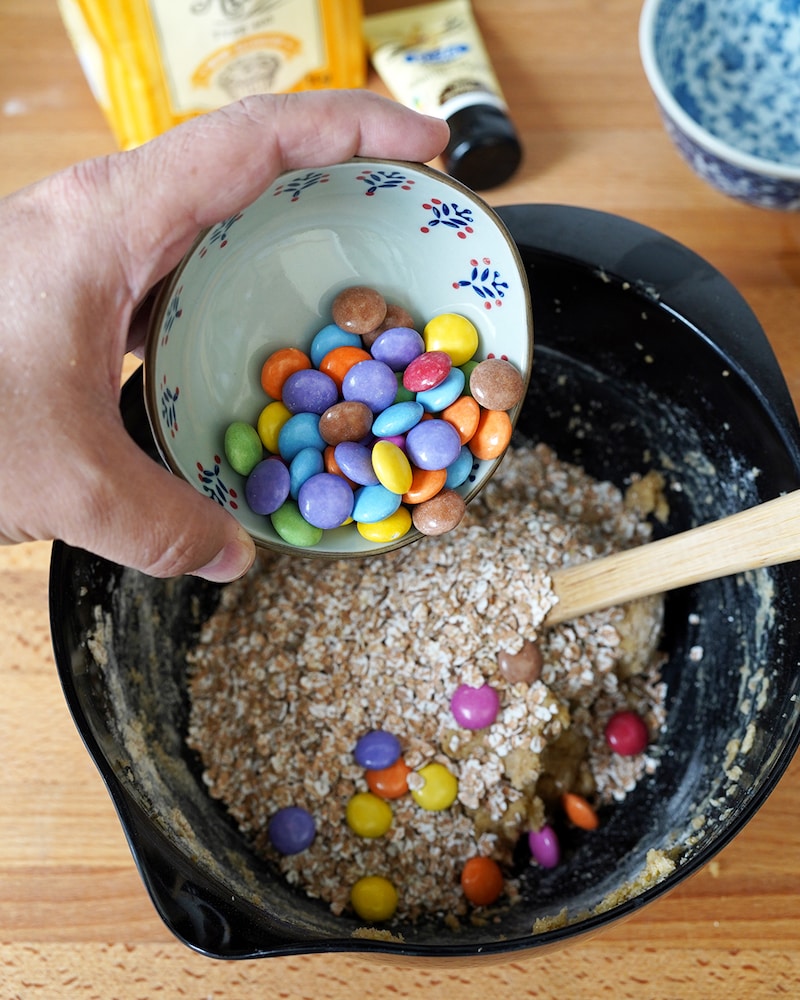 Mehl, Backpulver, Zimt und Salz mischen, in die große Schüssel geben und gut vermengen. Die Haferflocken und Schokolinsen vorsichtig unterheben. Die Schüssel abdecken und für etwa 1 Std. in den Kühlschrank stellen.