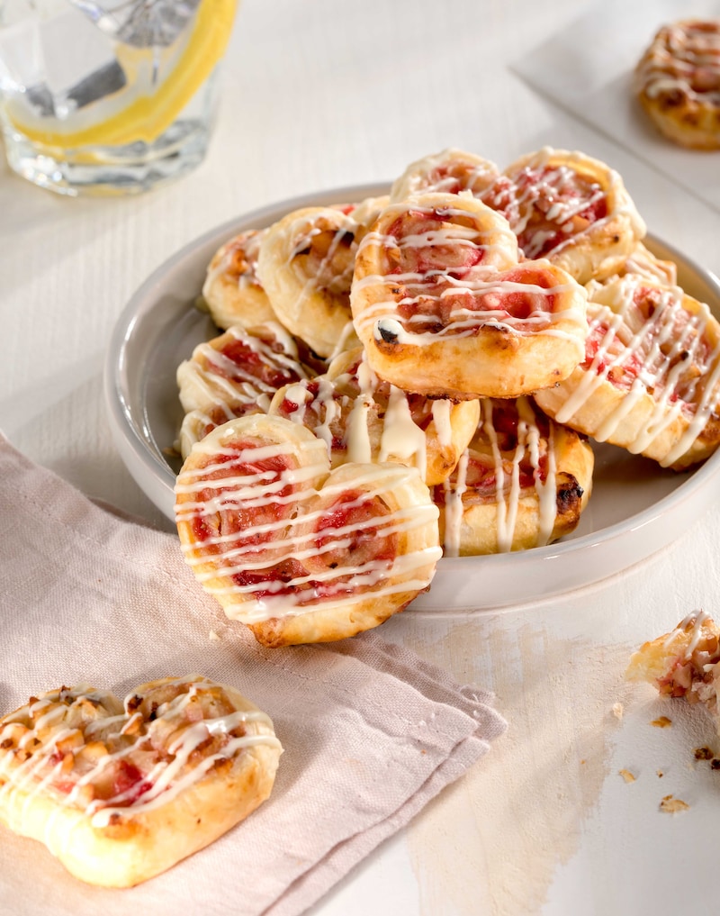 Teig von den beiden langen Seiten her zur Mitte hin aufrollen – dabei das evtl. anhaftende Papier abziehen. Diese Wurst nun in ca. 1 cm dicke Taler schneiden, diese in die Form eines Herzens drücken. Dabei die Mulde und die Spitze gut herausarbeiten! Die Rundungen leicht auseinanderziehen.