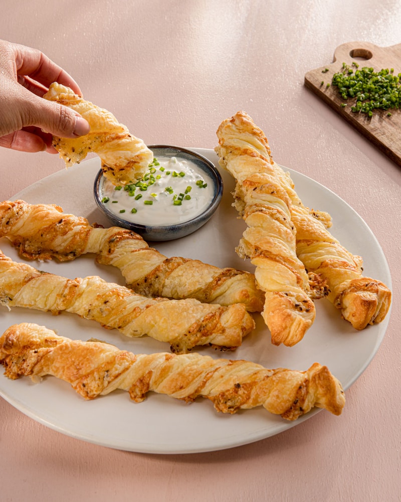 Gefüllten Blätterteig mit einem scharfen Messer in 10 ca. 2 cm dicke Streifen schneiden, dabei ggf. das noch anhaftende Papier entfernen. Streifen für Streifen mit etwas Abstand zueinander auf dem Backblech verteilen, dabei lang ziehen und in sich verdrehen. Im Ofen ca. 15 Min. backen, bis sie goldbraun und knusprig sind.