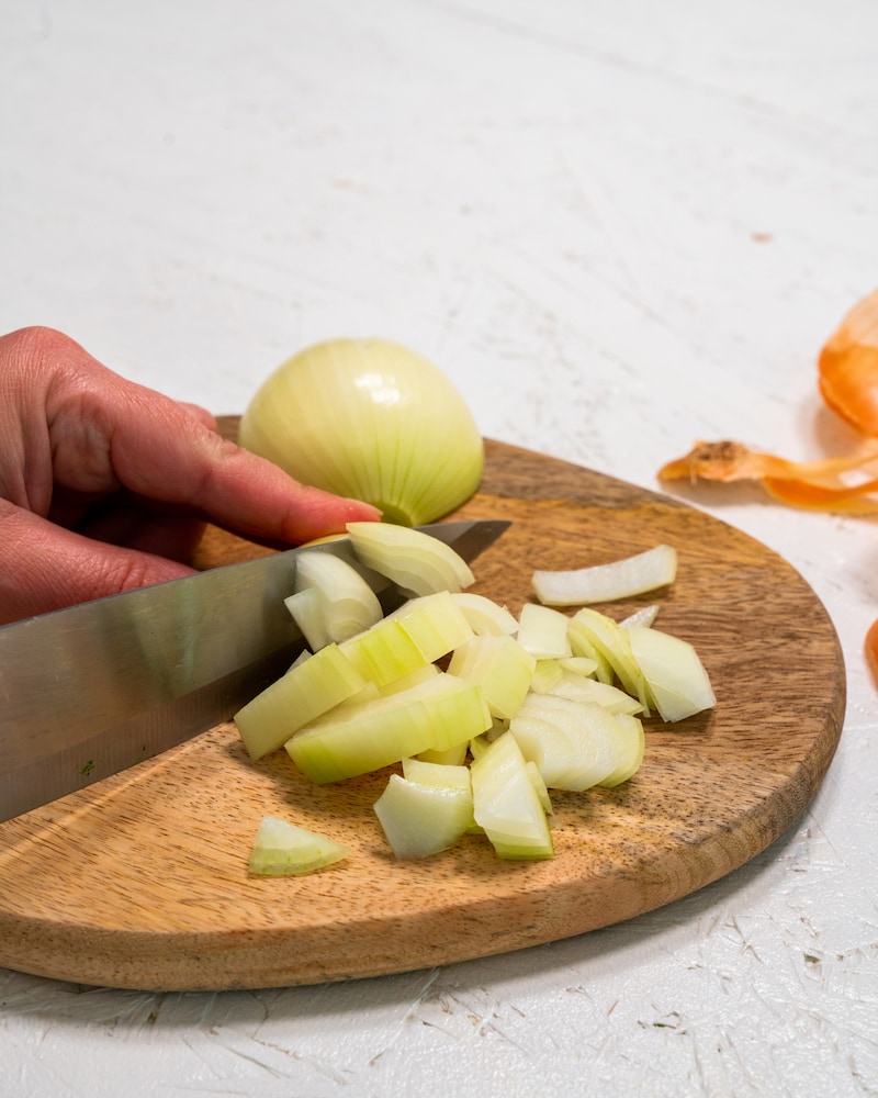 Zwiebeln schälen und kleinschneiden.
