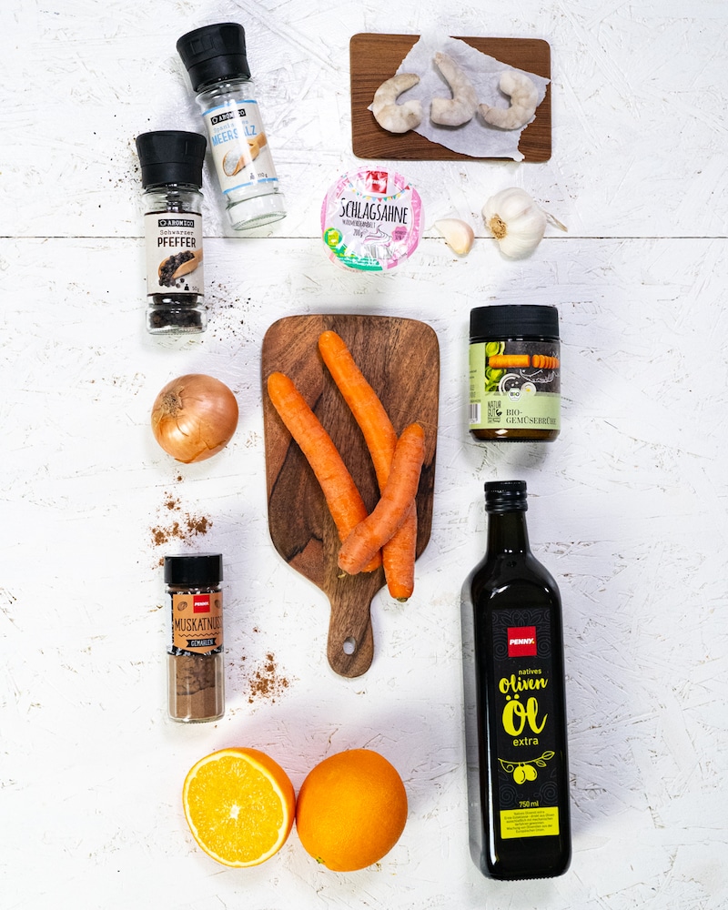 Spätestens jetzt müssten die Möhren auch weich sein. Nimm also den Topf vom Herd und püriere die Suppe mit einem Stabmixer, bis kein Stückchen mehr zu sehen ist. Achtung! Pass auf die heiße Spritzer auf! Zuletzt schmeckst du mit Salz und Muskatnuss ab.