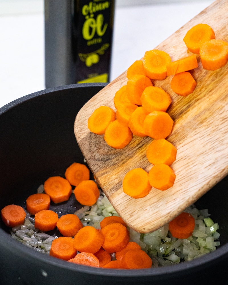 Widme dich jetzt den Hauptakteuren: Die Karotten mit einem Sparschäler schälen und klein schneiden. Die Stücke können jetzt für ca. 2 Min. im Topf mitrösten.