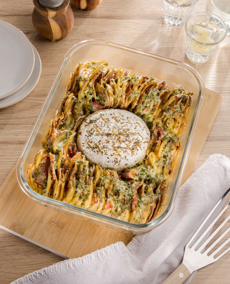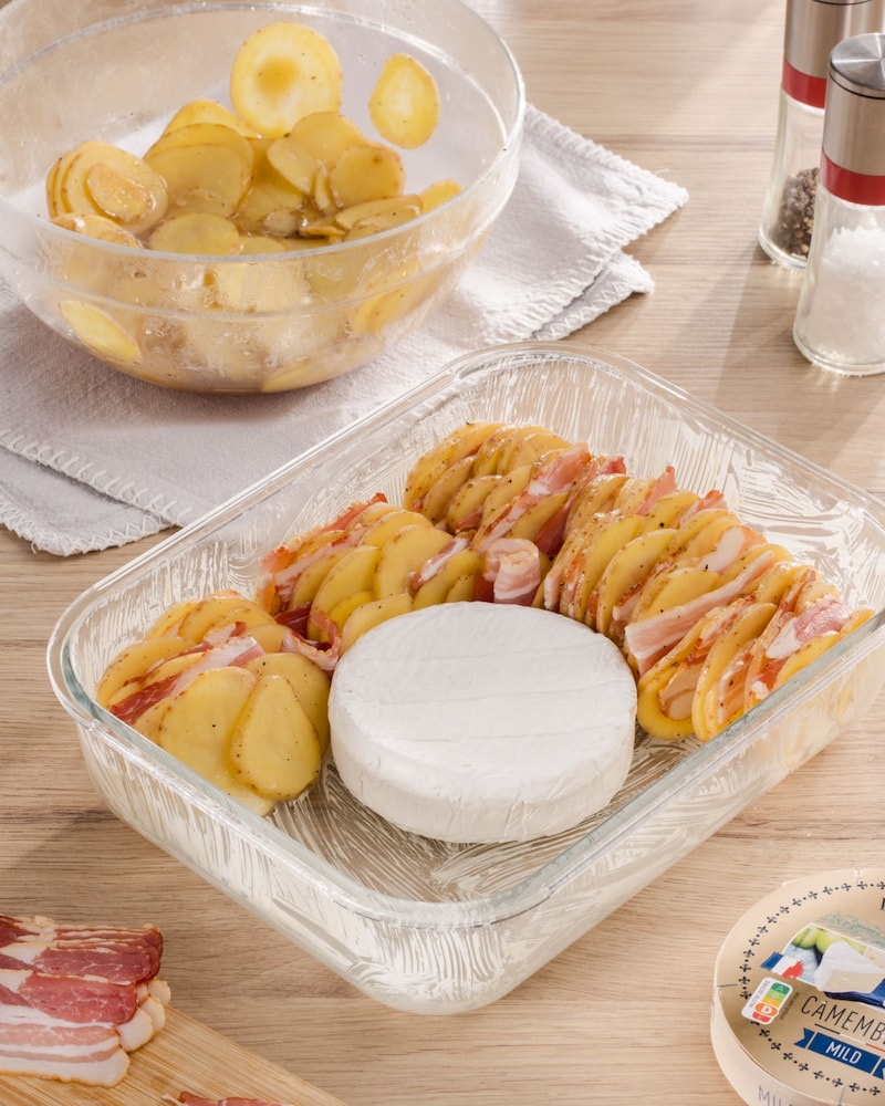 Camembert auspacken, in die Mitte der Form legen und die Kartoffelscheiben sowie den Speck drumherum verteilen.