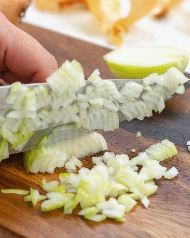 Zwiebeln schälen und in kleine Würfel schneiden.