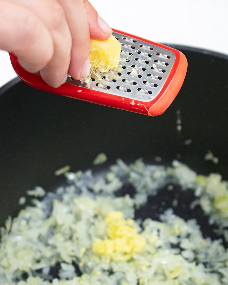 Ingwer schälen und fein reiben oder sehr klein schneiden.