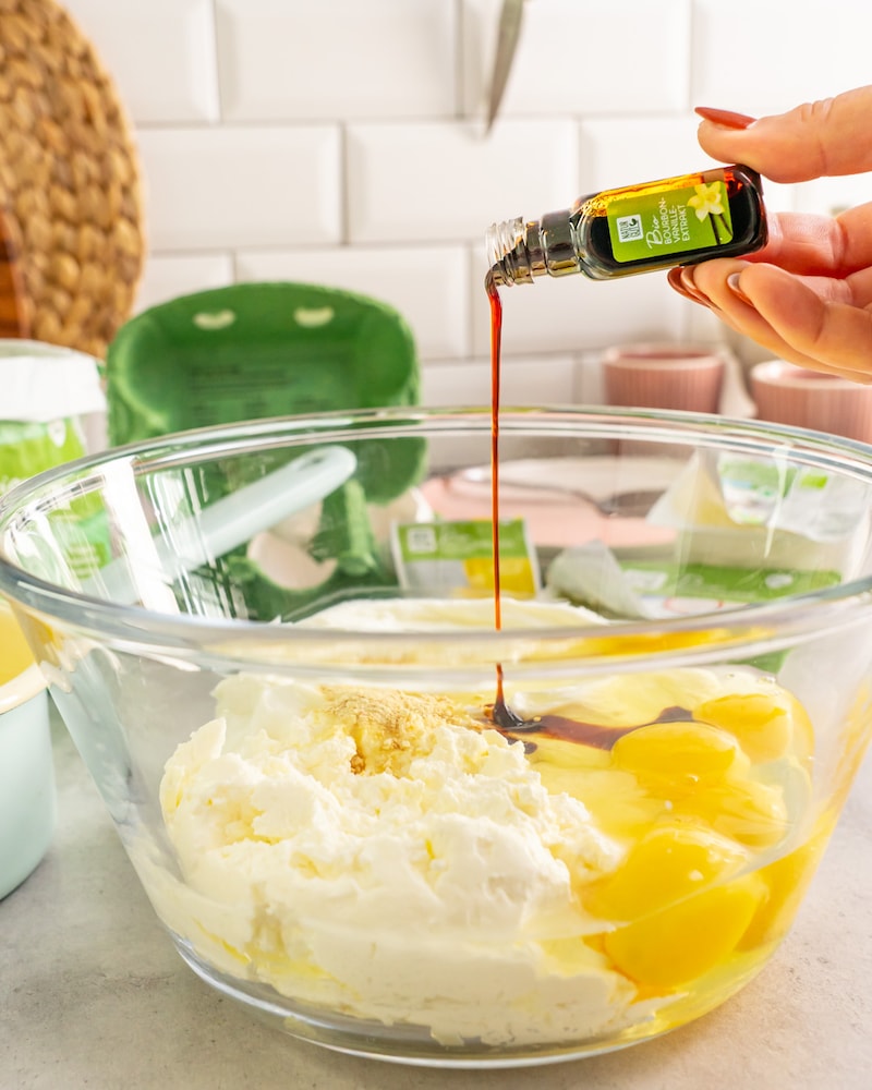 Frischkäse, Quark, Mehl, Eier, Zitronenschale und Vanilleextrakt verrühren und den Butter-Zucker-Mix nach und nach unterziehen.