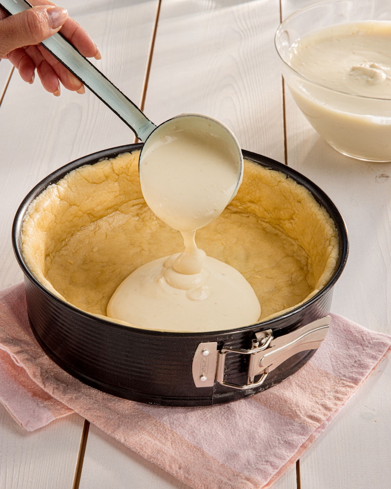 Die Käsekuchenmasse auf den Teig in der Form geben und gut verteilen. Kuchen im Ofen ca. 50 Min. backen, dann in der Form abkühlen und fest werden lassen.