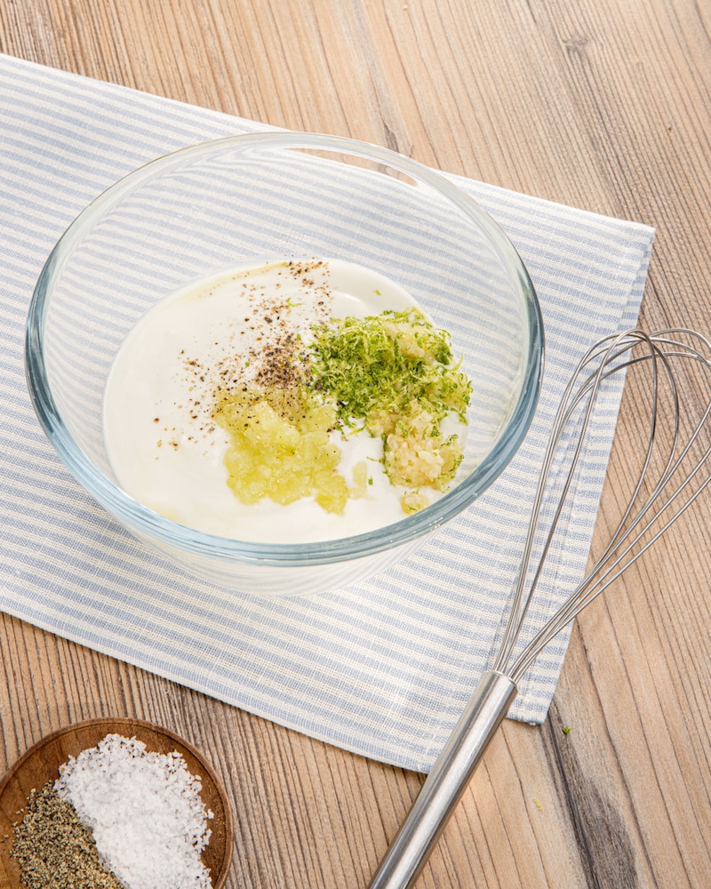 Joghurt, Honig, Salz und Pfeffer in die Schüssel geben und alles kräftig verrühren.