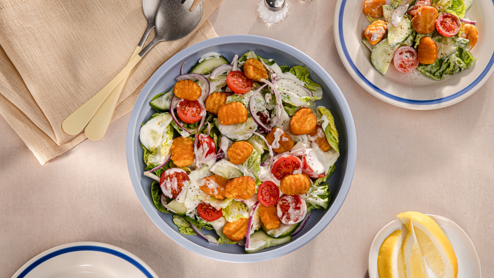 Joghurt mit Dill, Mayonnaise, Senf und Honig zu einem Dressing verrühren. Mit etwas frisch gepresstem Zitronensaft sowie Salz und Pfeffer abschmecken und zu den Salat-Zutaten in die Schüssel geben.